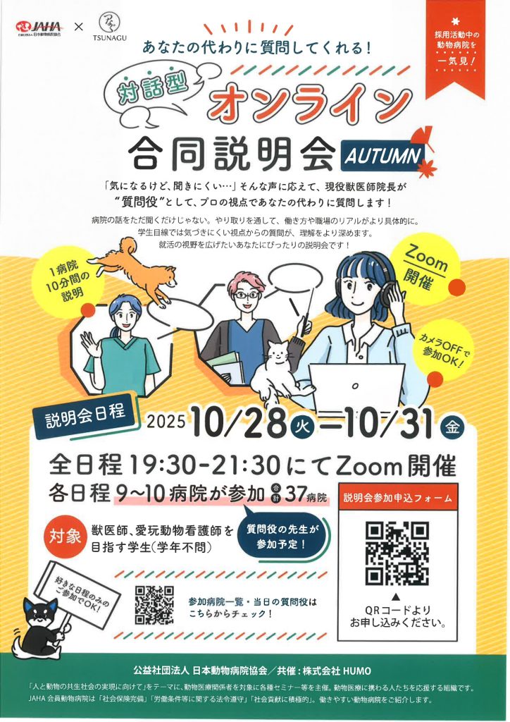 日本動物病院協会より、合同説明会の案内が届きましたのでご紹介いたします。