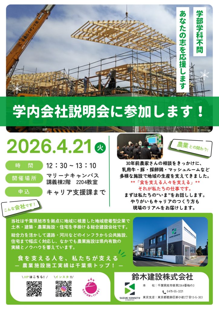 鈴木建設株式会社より、学内説明会のお知らせです。