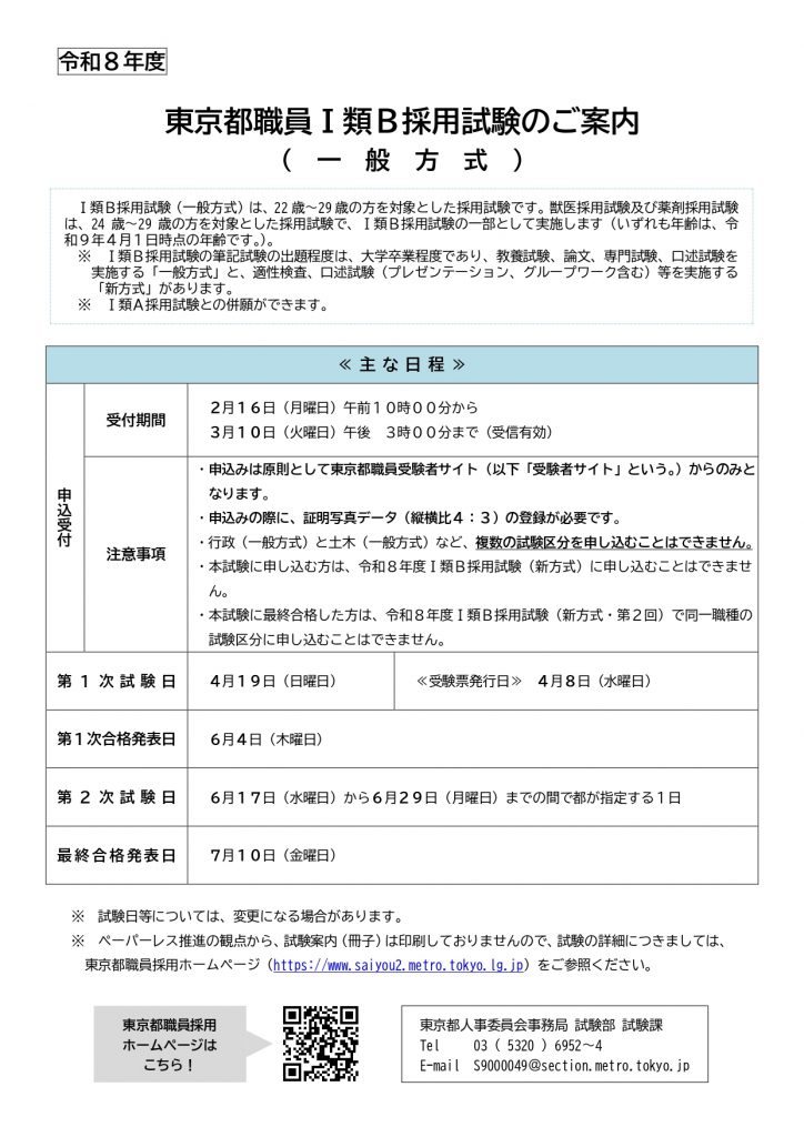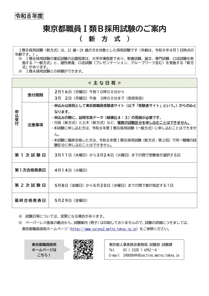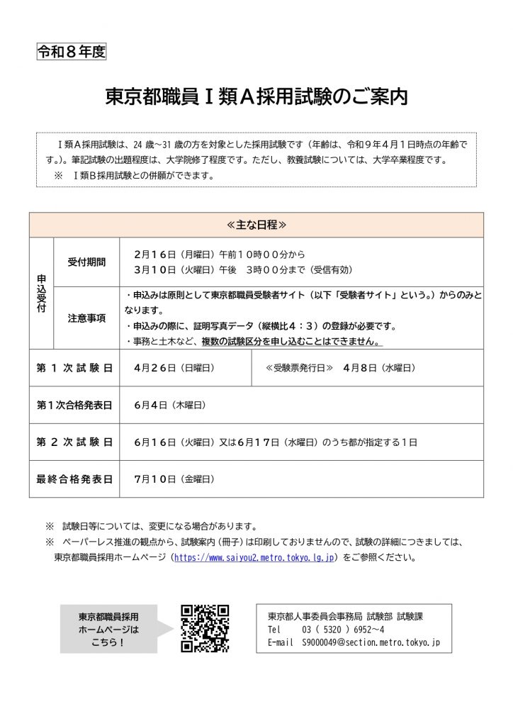 東京都人事委員会事務局試験部試験課より、令和8年度東京都職員採用試験(Ⅰ類A及びⅠ類B)について、本日2月16日(月)から試験案内が公表、申し込み開始となりましたので、お知らせします。