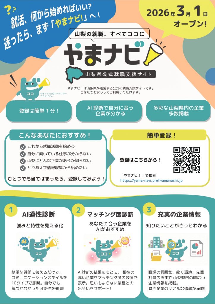 山梨県では、大学生等の県内就職を促進するため、新しい就職支援サイト「やまナビ!」を令和8年3月1日に開設します。