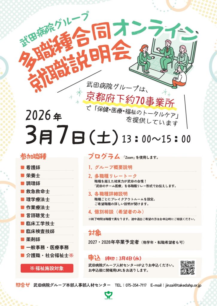 武田病院グループより、多職種合同オンライン就職説明会の案内が届いています。