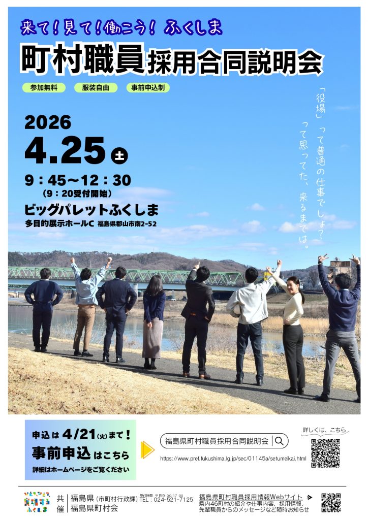 HOME イベント 福島県町村職員採用合同説明会 イベント 危機管理学部 2026/4/25 - 福島県町村職員採用合同説明会 #27卒#公務員#対面 公開日:2026.02.27 福島県よりイベントの案内が届きましたのでご紹介します。 福島県で公務員として就職を考えている学生は、ぜひ参加してください。 令和8年度福島県町村職員採用合同説明会を開催します! – 福島県ホームページ 一覧へ戻る